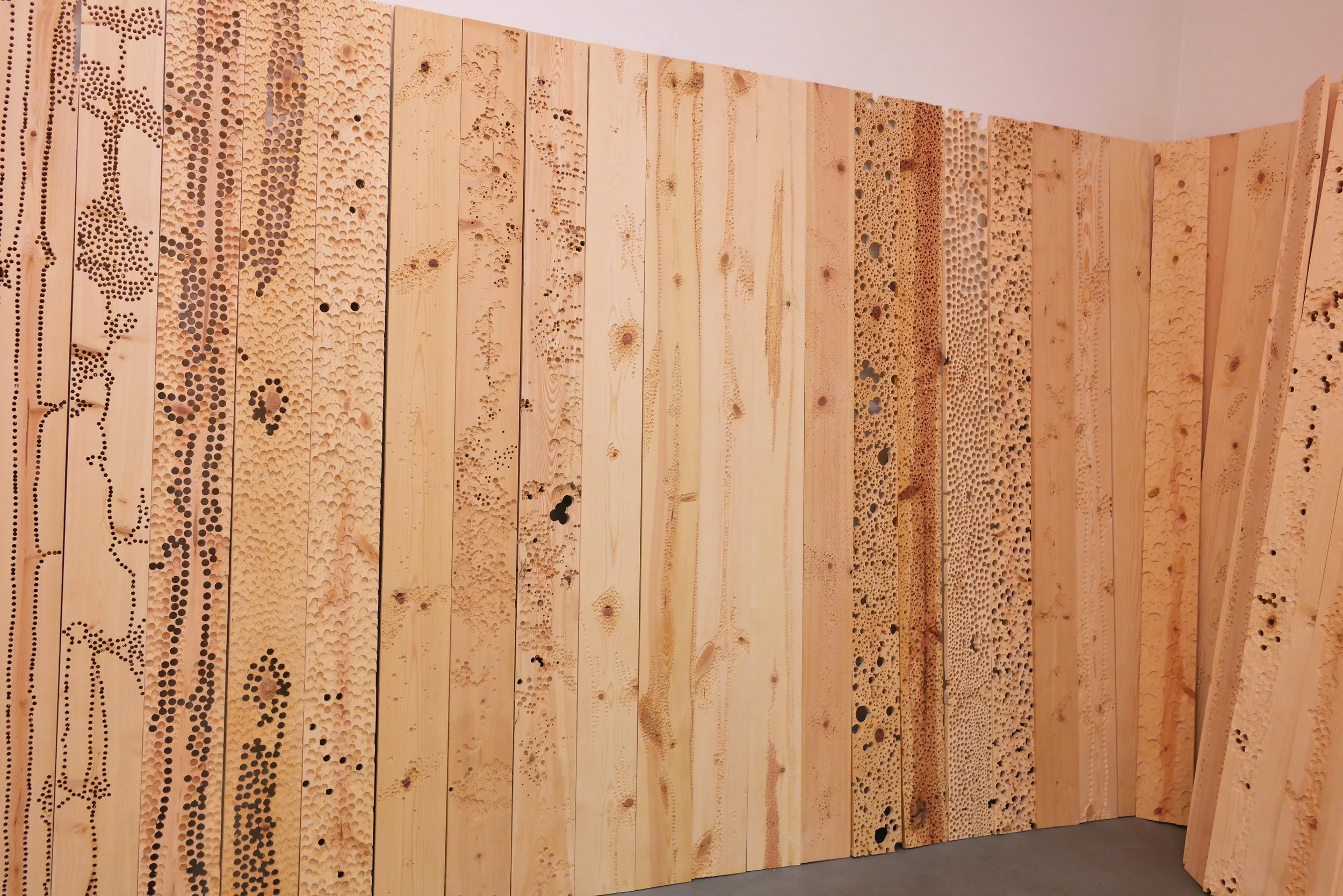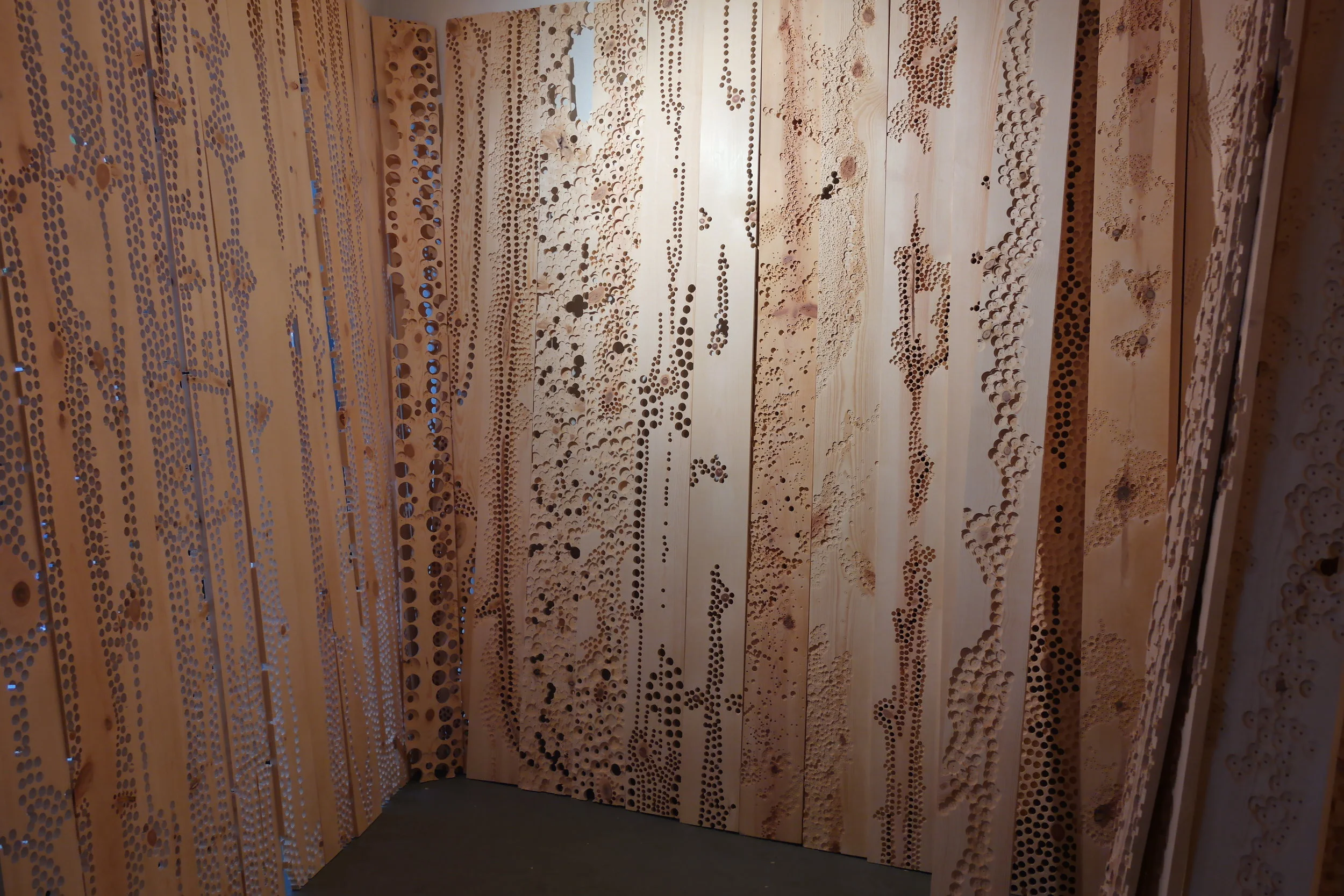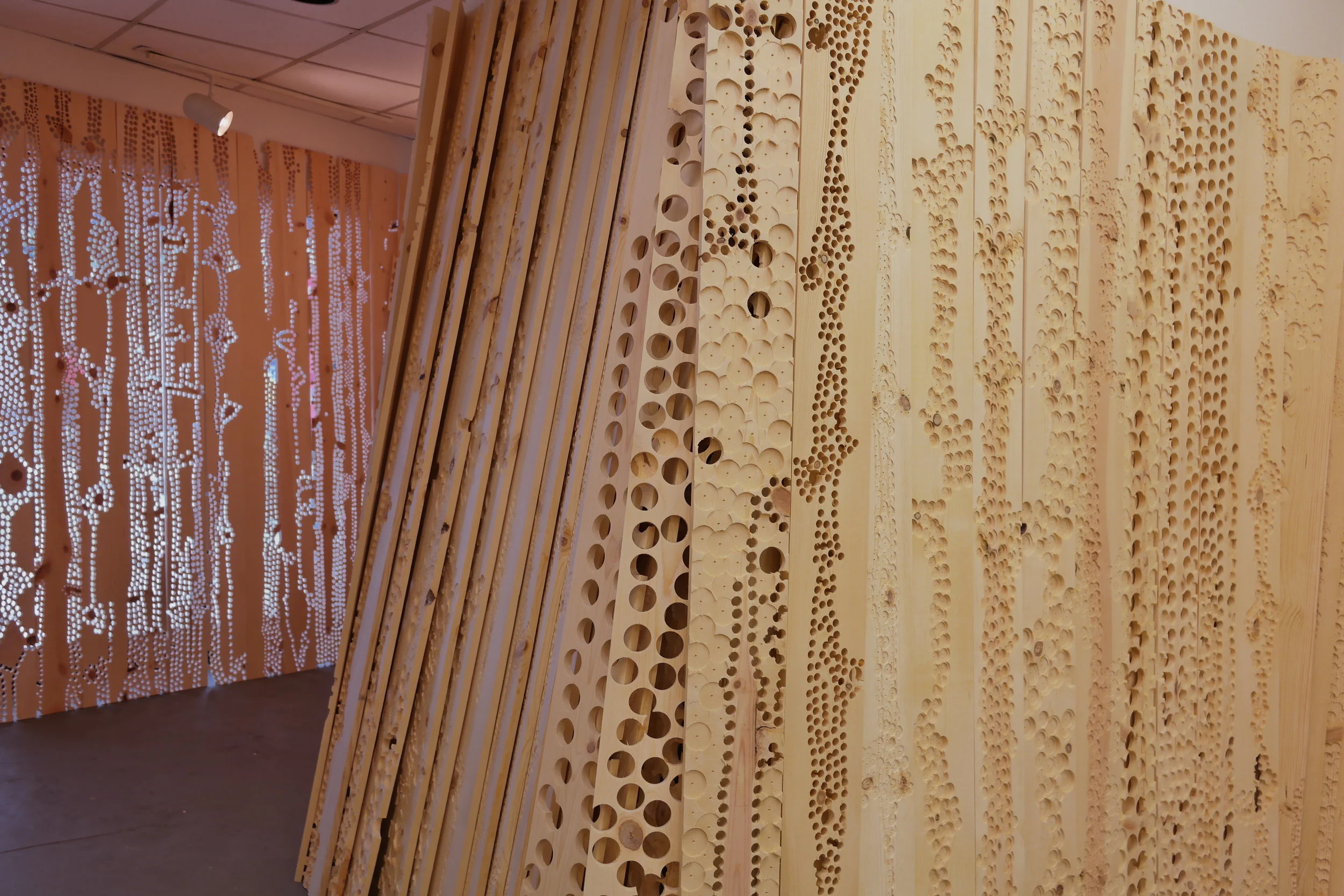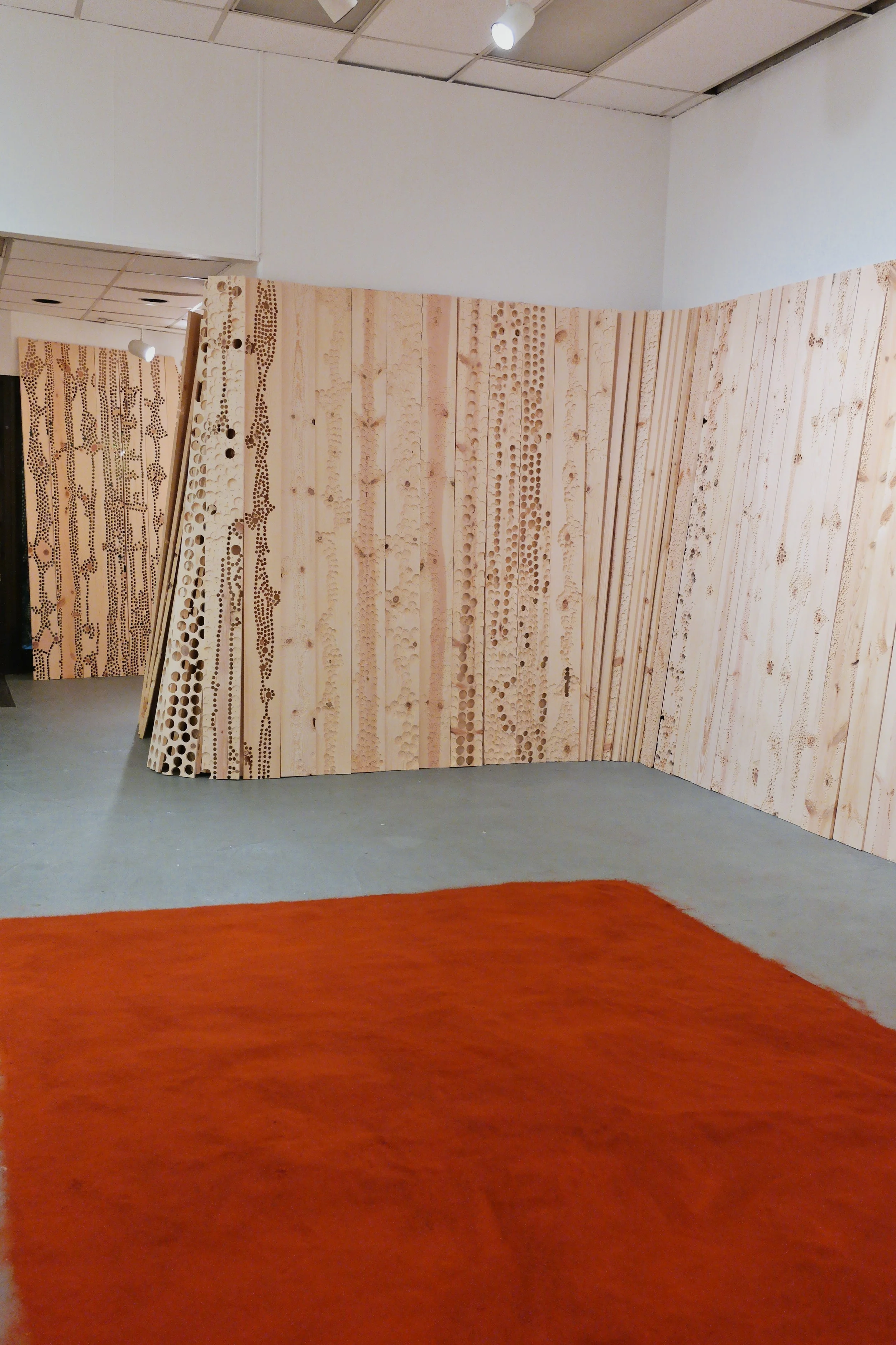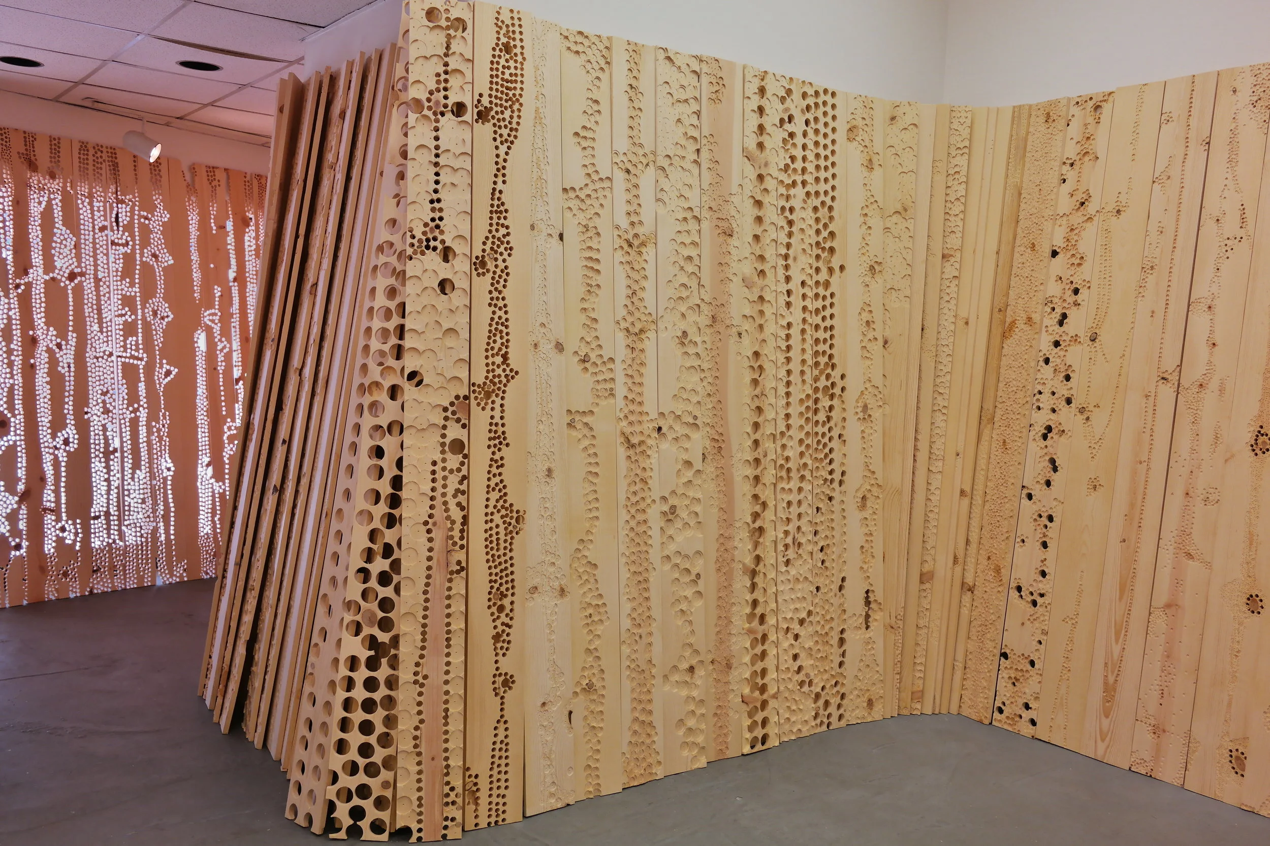 Site-specific installation that addresses ideas of deterioration through the process of mark making. The installation fills the entire gallery space with more than 250 wood panels, which are indented and drilled to varying degrees, effectively warping the space. The interplay of light and shadows on the wooden panels with lines, indentations, and drilled worm-like holes, play an important part in highlighting the impermanence of one’s existence; they are meant to illustrate the passage of time.