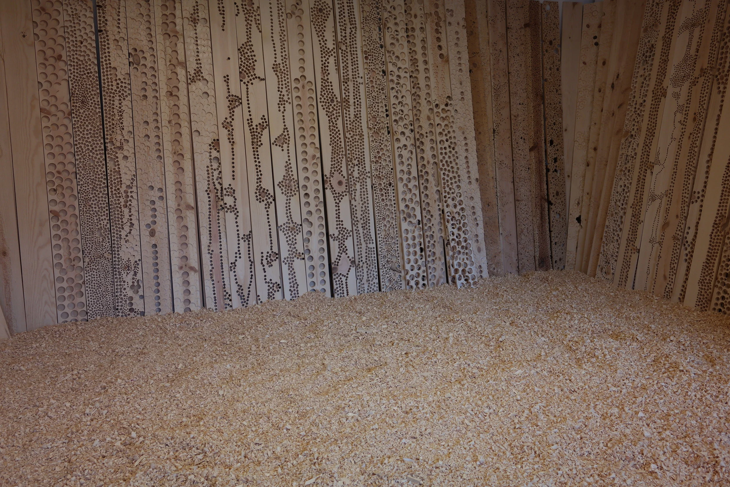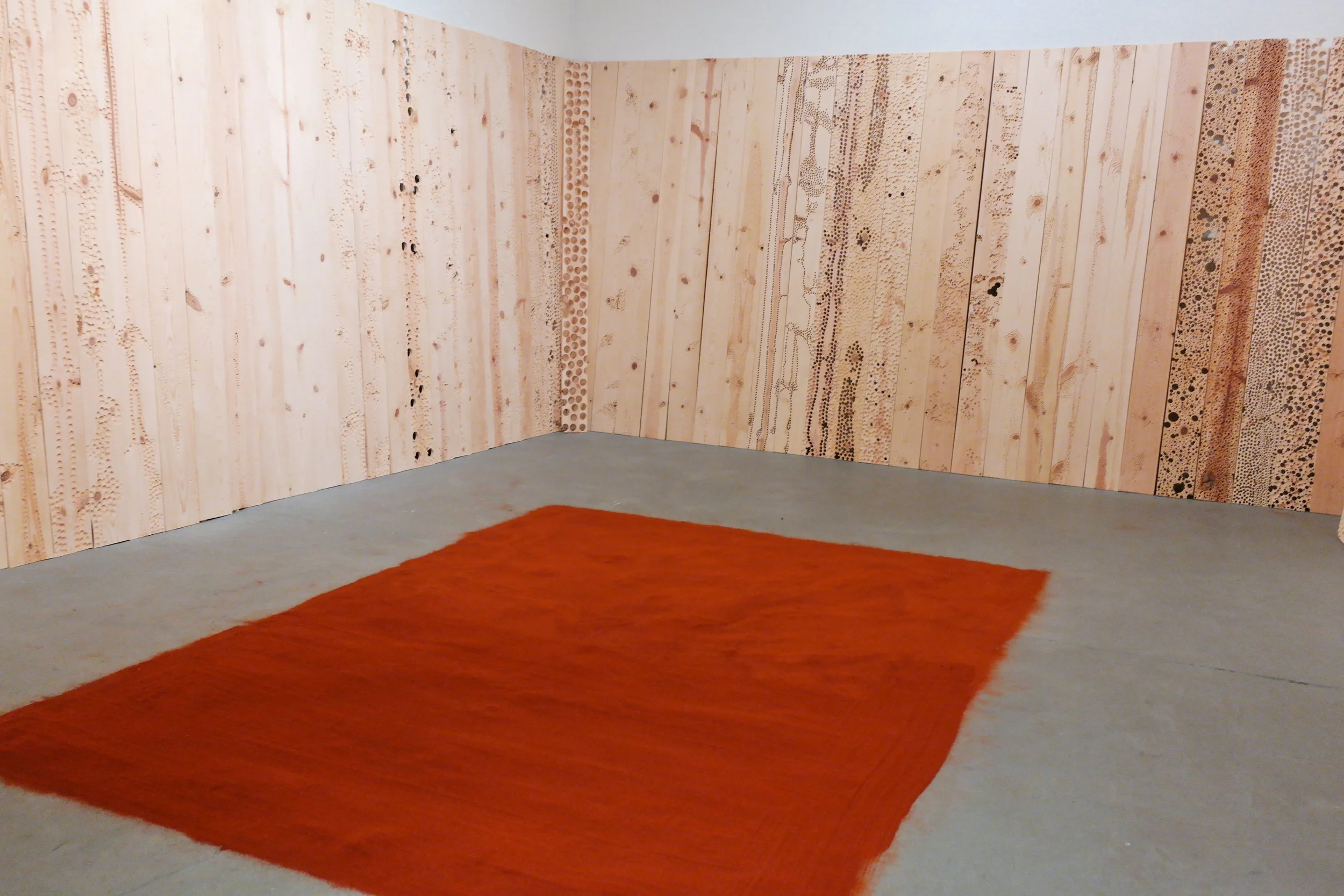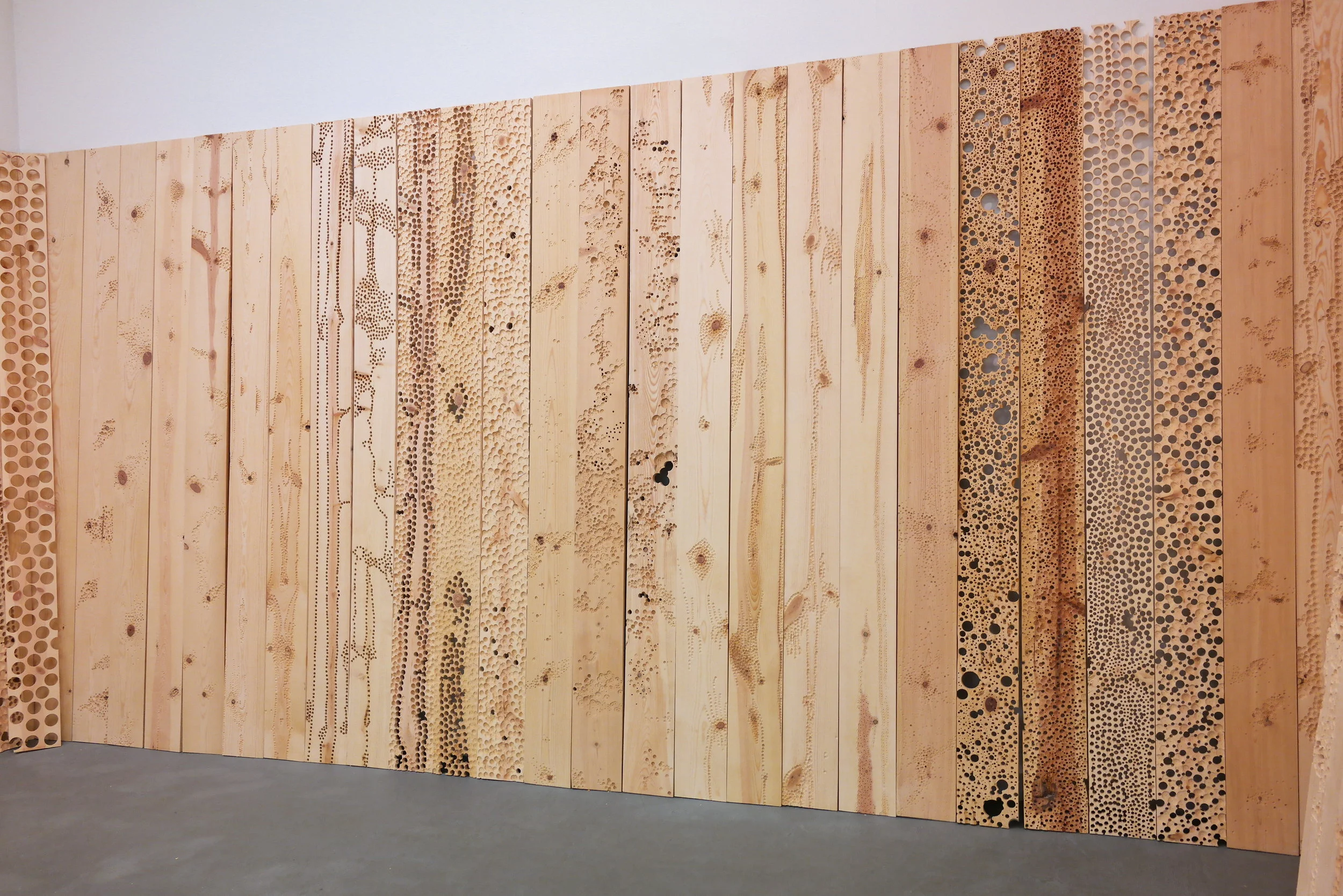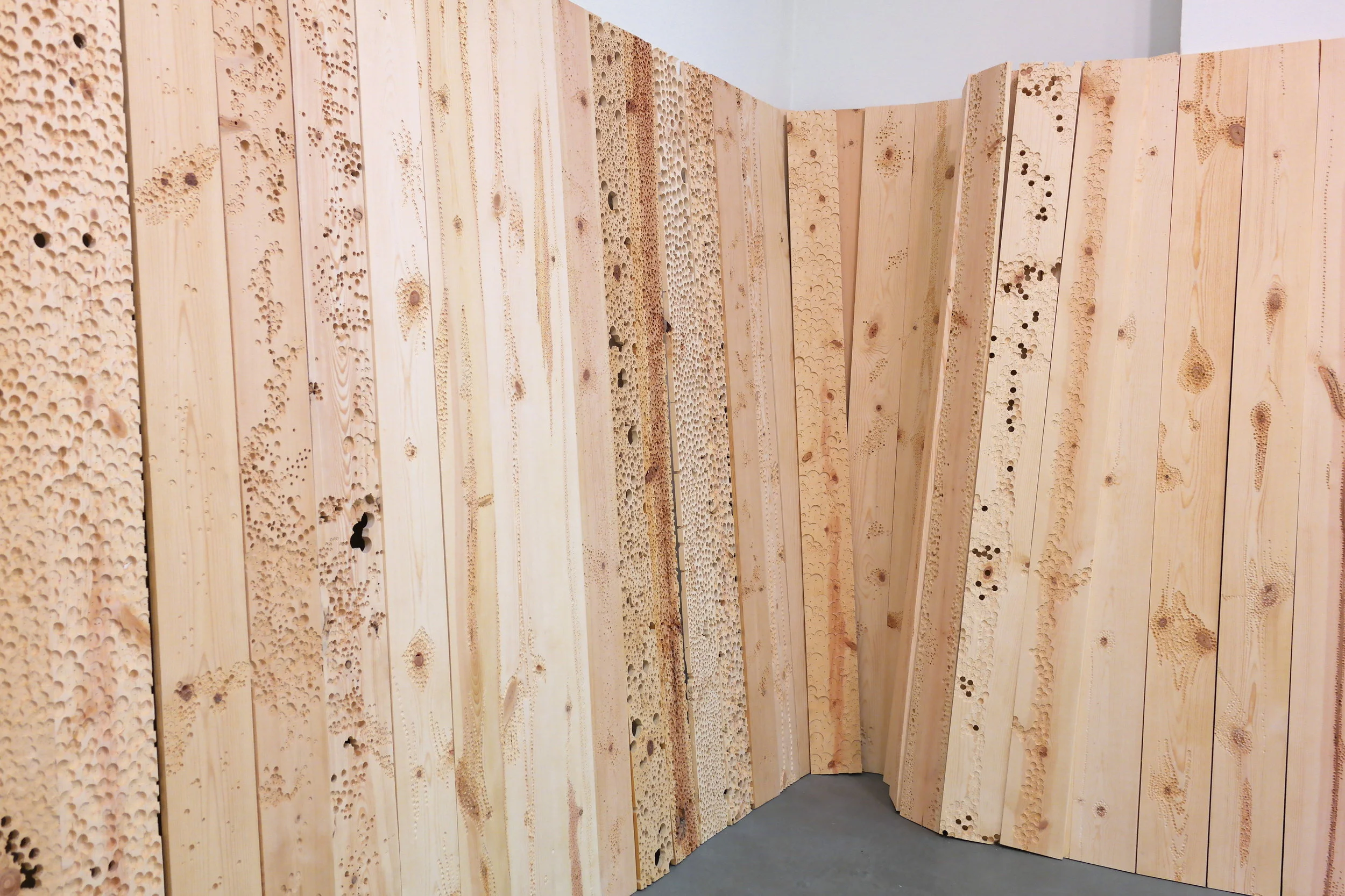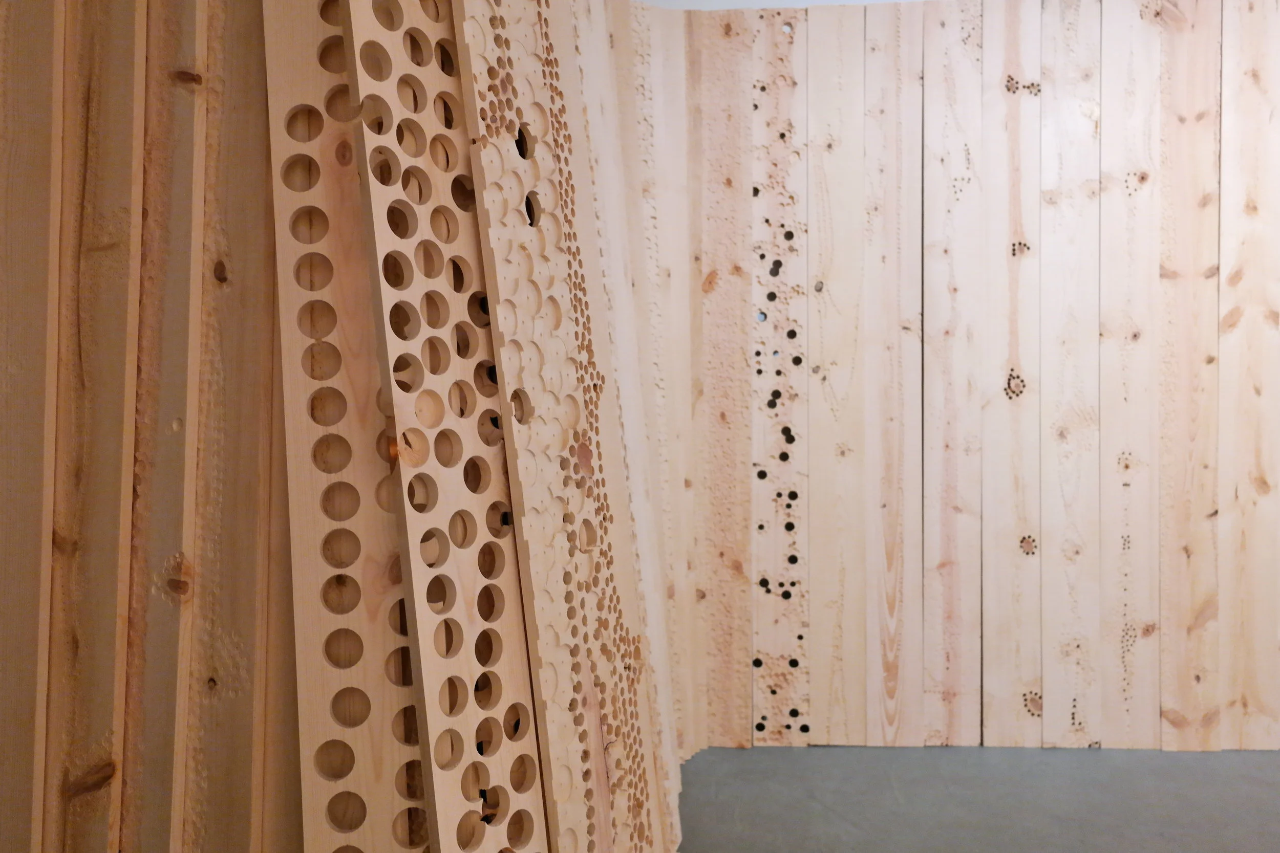 Site-specific installation that addresses ideas of deterioration through the process of mark making. The installation fills the entire gallery space with more than 250 wood panels, which are indented and drilled to varying degrees, effectively warping the space. The interplay of light and shadows on the wooden panels with lines, indentations, and drilled worm-like holes, play an important part in highlighting the impermanence of one’s existence; they are meant to illustrate the passage of time.