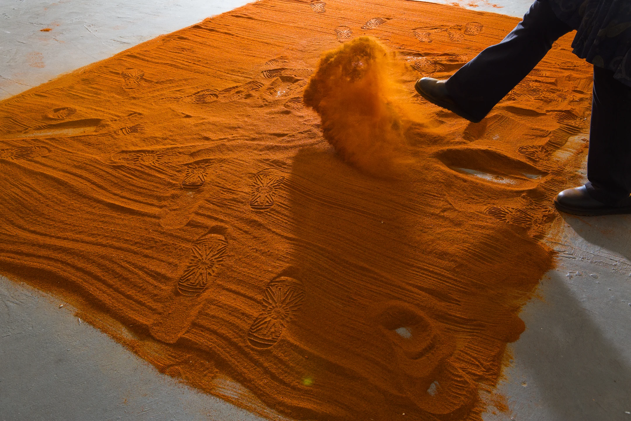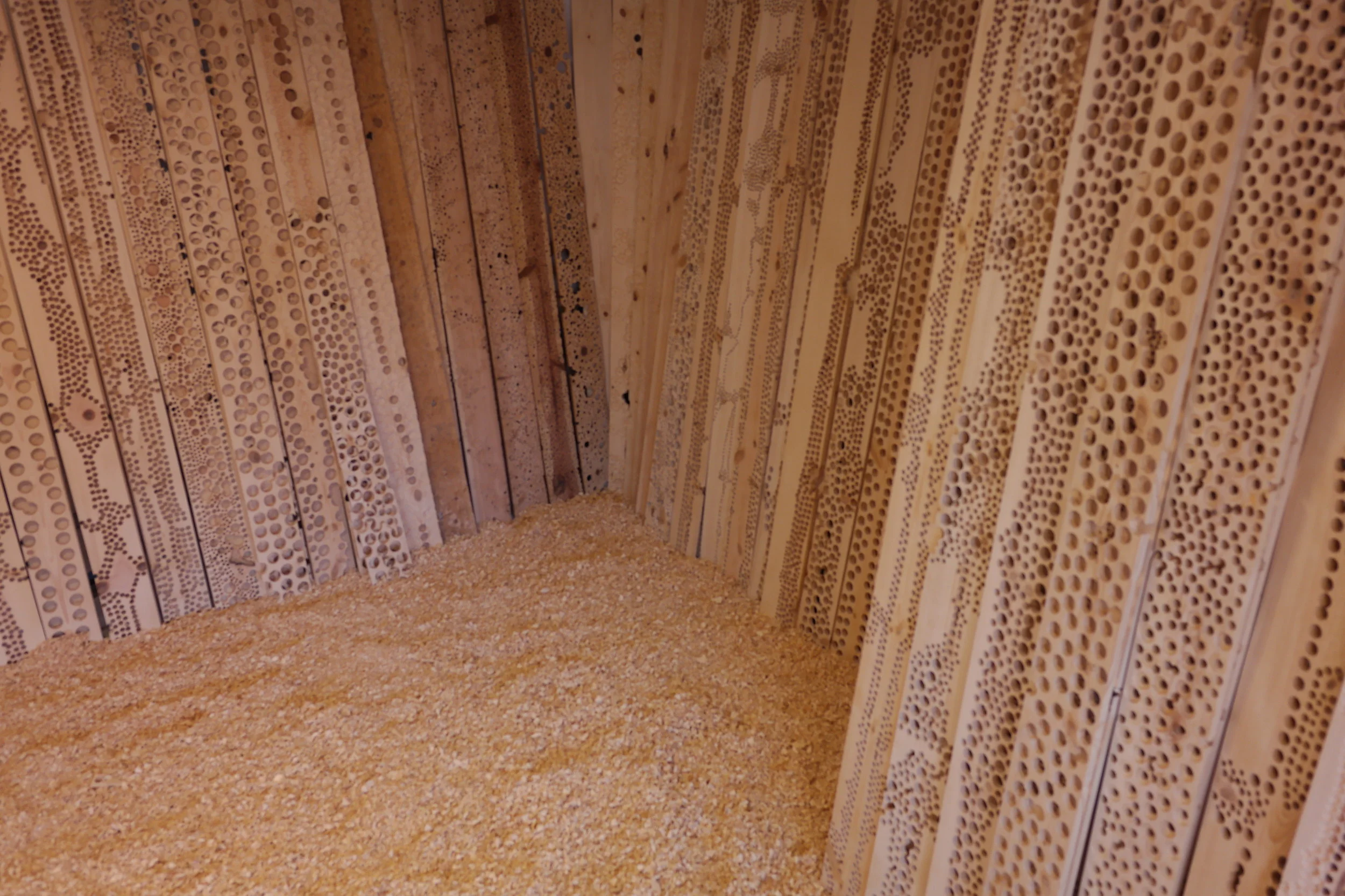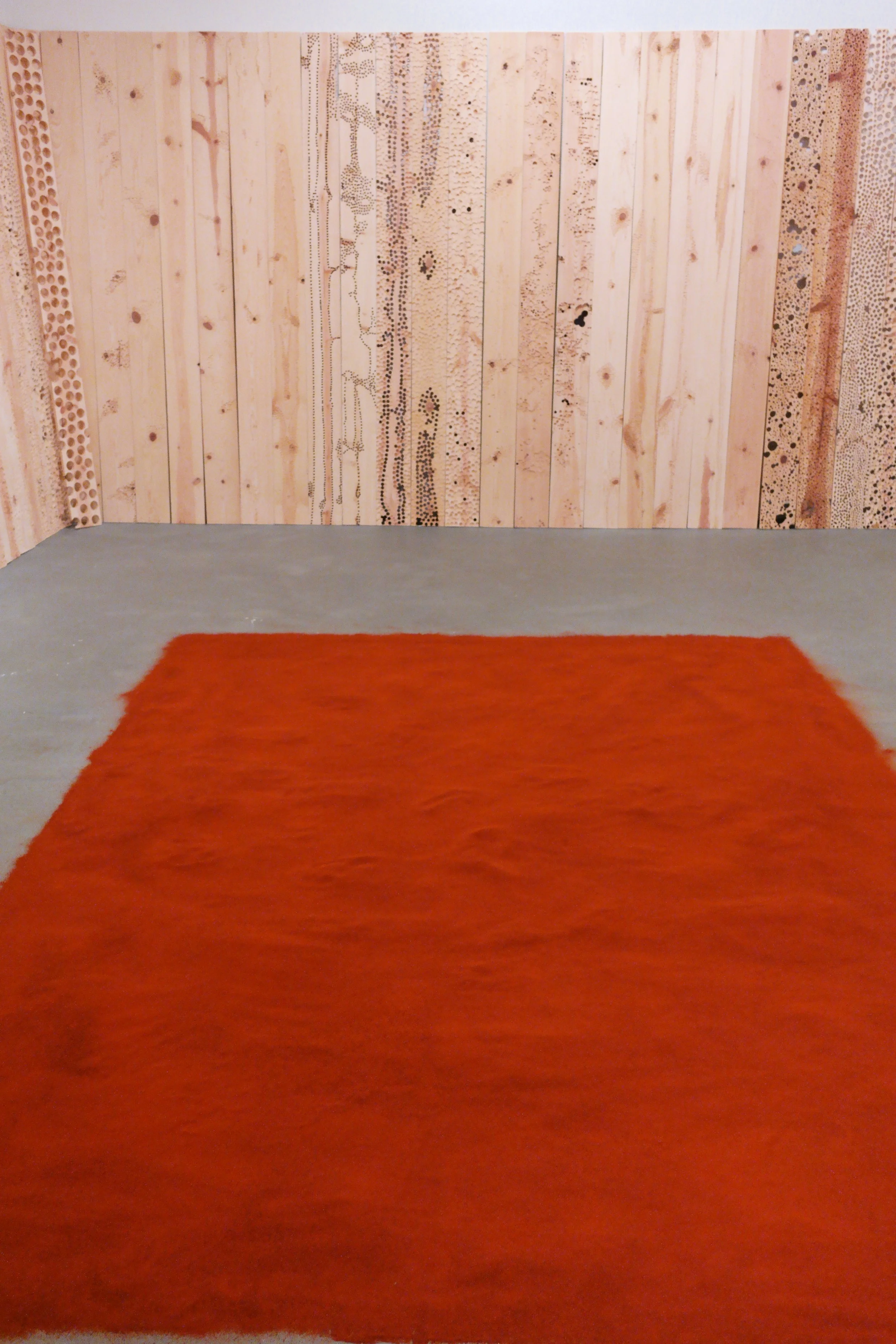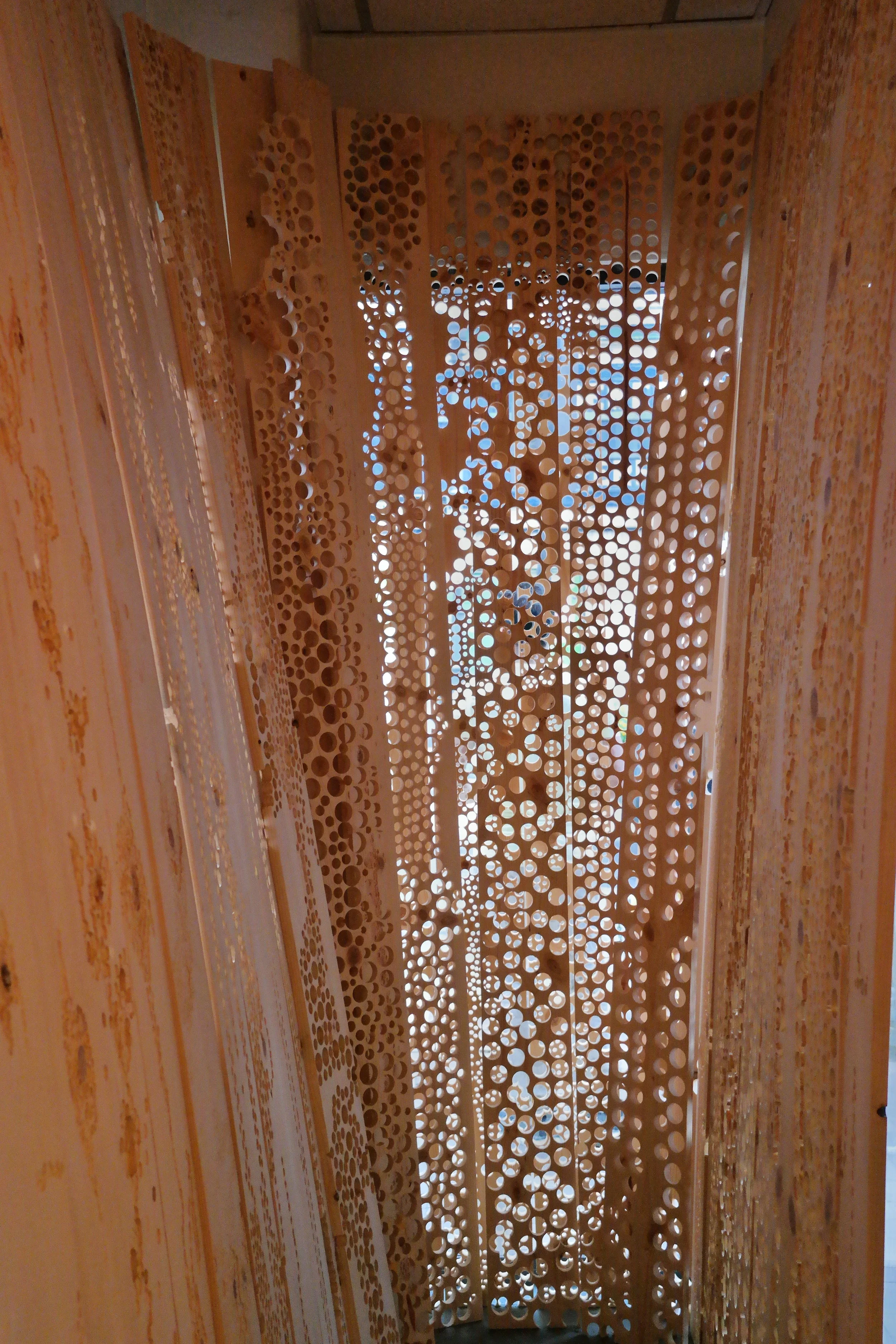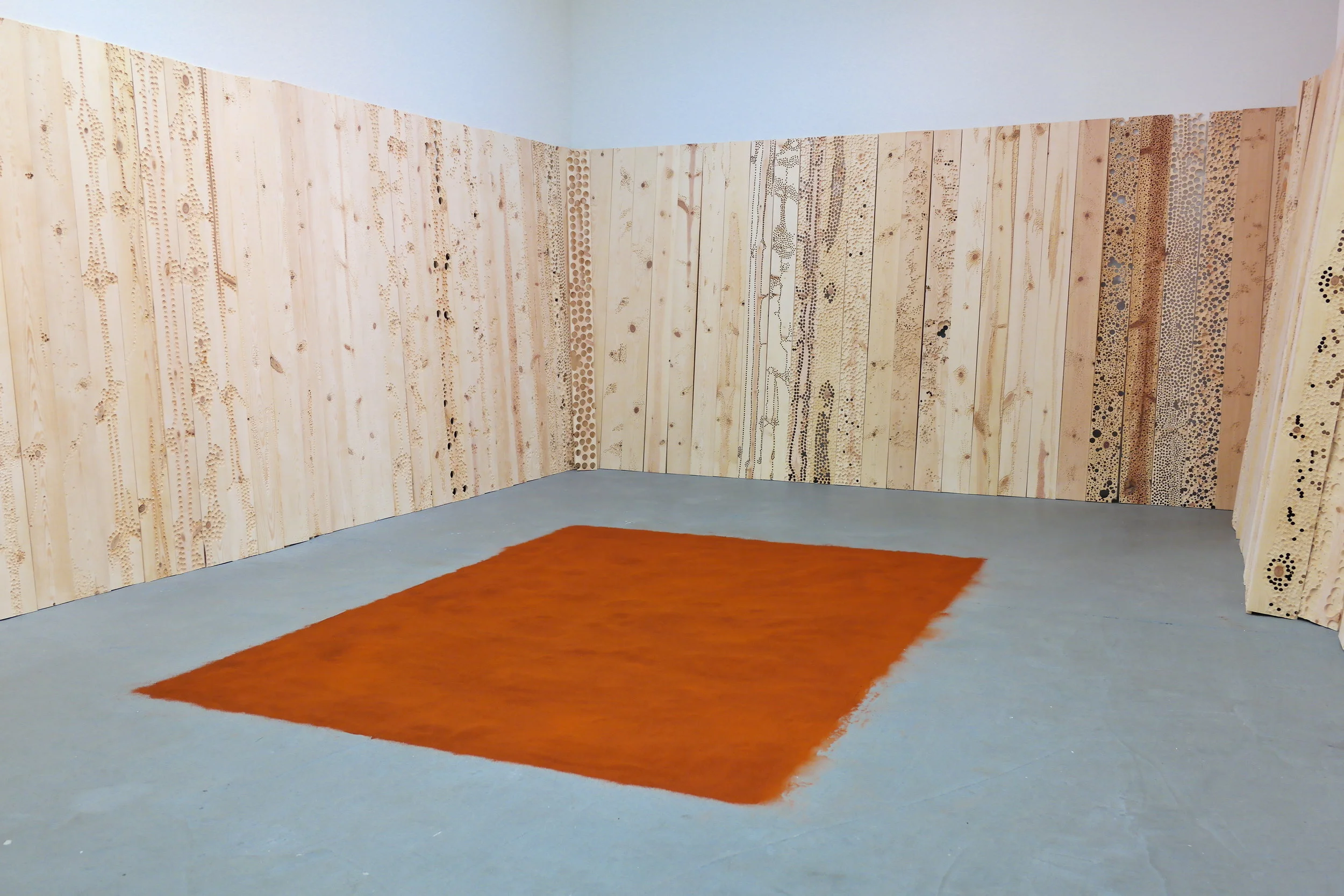 Site-specific installation that addresses ideas of deterioration through the process of mark making. The installation fills the entire gallery space with more than 250 wood panels, which are indented and drilled to varying degrees, effectively warping the space. The interplay of light and shadows on the wooden panels with lines, indentations, and drilled worm-like holes, play an important part in highlighting the impermanence of one’s existence; they are meant to illustrate the passage of time.